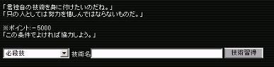 6. 必殺技の習得 オールドタイプになると必殺技を習得できます。好きな技名と種類を設定してください。 ※技の種類 必殺技:相手に大ダメージを与えます。 攻撃回避:相手の攻撃を回避します。 敵麻痺:相手を数ターン麻痺させます。 敵継続ダメージ:相手に数ターンダメージを与えつづけます。 耐久力回復:耐久力を回復します。 EN回復:ENを回復します。 |