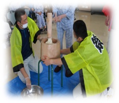 「救急員養成講習」:12時間の講習で基礎講習以外の傷、骨折、急病等に対する止血方法、三角巾を用いた応急措置、傷病者の搬送方法についての知識と技術を学ぶものです。後半には災害時を想定した総合実技、最後には資格付与のための学科と実技検定を受け、晴れて「赤十字救急員」となれるものです。