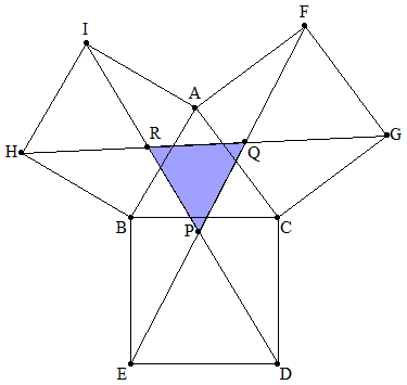 △ABCの外側に正方形BCDE,CAFG,ABHIを作る。DIとEF, EFとGH,GHとDIとの交点をそれぞれP,Q,Rとする。 次の場合について,△PQRの面積を求めよ。 (1) ∠A=90°,CA=b,AB=c (2) BC=15,CA=14,AB=13 (3) BC=a,CA=b,AB=c | ![]() |