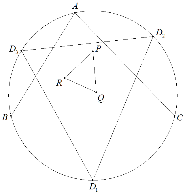 △ABCにおいて,頂点を含まない外接円の弧BC,CA,ABの 中点をそれぞれD1,D2,D3とし,辺BC,CA,ABに関する D1,D2,D3の対称点をそれぞれP,Q,Rとする。 △D1D2D3∽△PQRであることを証明せよ。 なお,△PQRを△ABCのFuhrmann三角形という。 | ![]() |