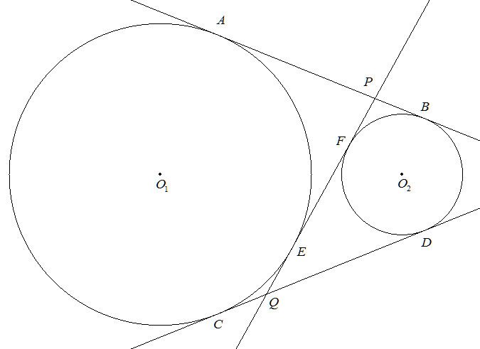 2円O1,O2の共通外接線ABと共通内接線EFの交点をPとする。 2円O1,O2の直径がそれぞれ,17,7で,O1O2=13のとき,PBを 求めよ。 | ![]() |