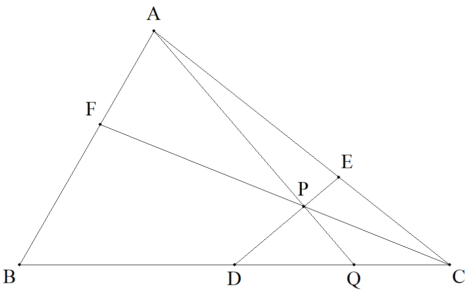 △ABCについてBCを1:k,CAを1:l,ABを1:mに内分す る点をそれぞれD,E,Fとする。CFとDEの交点をPとし, APとBCの交点をQとするとき,BQ:QCを求めよ。 | ![]() |