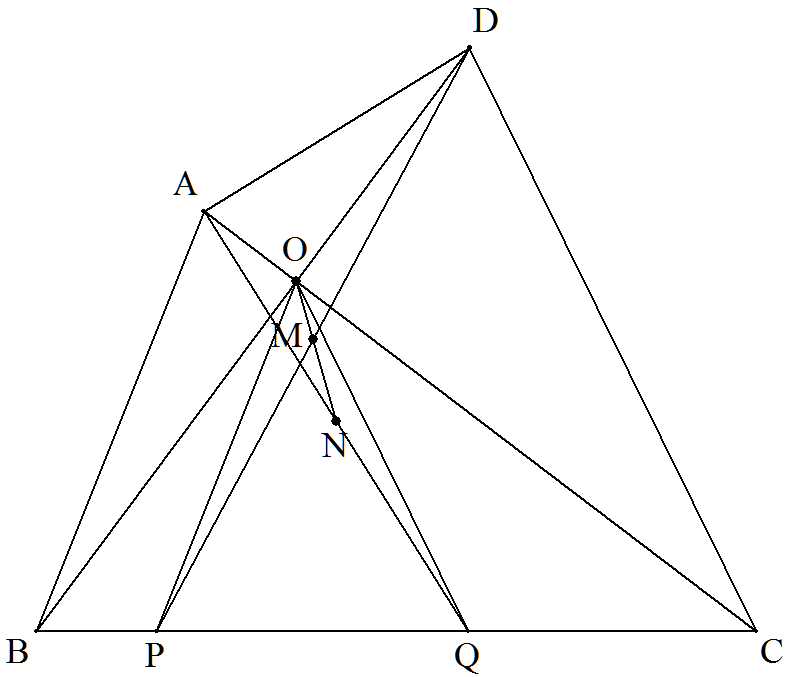 四角形ABCDの対角線AC,BDの交点Oを通り,AB,DCに平行に引いた 直線とBCとの交点をそれぞれP,Qとするとき,BP2+CQ2=PQ2ならば, DP,AQの中点M,NとOとは一直線上にあることを証明せよ。 (作:清宮俊雄) | ![]() |