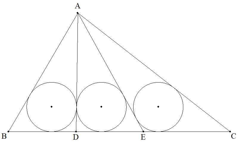 a=8,b=7,c=5である△ABCのBC上にBに近い方から2点D,Eをとる。 △ABD,△ADE,△AECの内接円の半径が等しくなるとき,その半径 およびBD,DE,ECをそれぞれ求めよ。 | ![]() |
