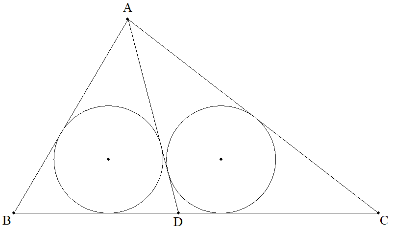 a=8,b=7,c=5である△ABCのBC上に点Dを,△ABDと △ACDの内接円の半径が等しくなるようにとる。 次をそれぞれ求めよ。 (1) BD (2) AD (3) 等円の半径 (4) BC=a,CA=b,AB=c(b>c)として,BDを求めよ。 | ![]() |