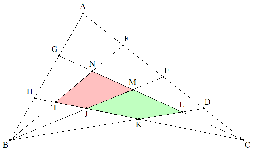 △ABCにおいて, CAの4等分点をCに近い方からD,E,F, ABの3等分点をAに近い方からG,Hとする。 CHとBF,BE,BDの交点をそれぞれI,J,K, CGとBD,BE,BFの交点をそれぞれL,M,N とする。このとき, (1) 四角形IJMN:四角形JKLMを求めよ。 (2) △ABC=1のとき,四角形IJMNと四角形 JKLMの面積を求めよ。 | ![]() |