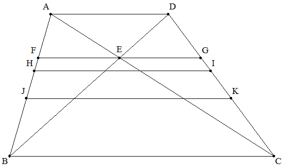AD∥BCである台形ABCDの対角線の交点をEとする。 線分FGはEを通りADに平行で, 台形AHID∽台形HBCI, 台形AJKD=台形JBCKとする。 AB=a,BC=b,CD=c,DA=d(d<b<a+c+d)のとき, (1) AF:FB,FGをそれぞれ求めよ。 (2) AH:HB,HIをそれぞれ求めよ。 (3) AJ:JB,JKをそれぞれ求めよ。 | ![]() |