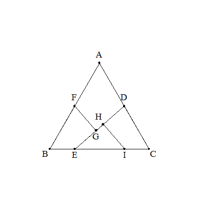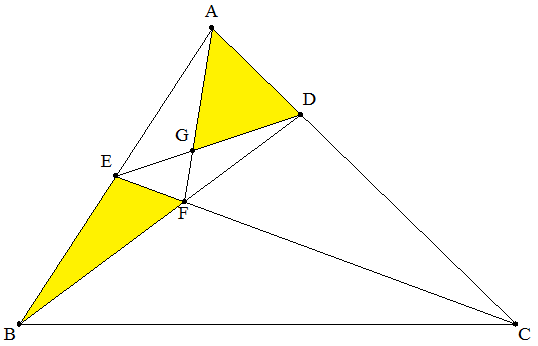 △ABCのCA上に点Dをとり,ABの中点をE,BD とCEの交点をF,AFとDEの交点をGとする。 △EBF=△AGDのとき,DA/CDの値を求めよ。 | ![]() |