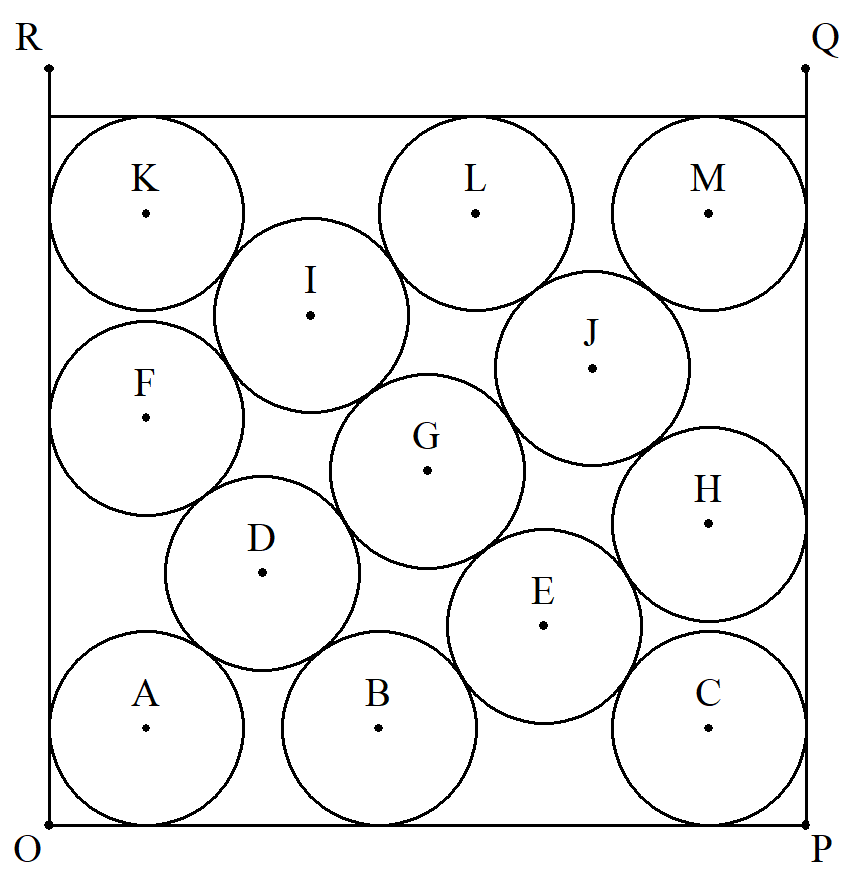 13個の半径1の円A,B,C,…,Mは次のように線分 RO,OP,PQで囲まれた部分に配置されている。 (RO⊥OP,OP⊥PQ) また,6<OP<8 とする。 円Aは,OP,ORに接している。 円Cは,OP,PQに接している。 円Bは,OPに接し,2円A,Cの間に任意にある。 ただし,その隙間は0と2√3-2の間とする。 円Dは,4円F,A,B,Gに接している。 円Eは,4円G,B,C,Hに接している。 円Fは,ORに接し,2円I,Dに接している。 円Gは,4円I,D,E,Jに接している。 円Hは,PQに接し,2円I,Dに接している。 円Iは,4円K,F,G,Lに接している。 円Jは,4円L,G,H,Mに接している。 円Kは,ORに接し,円Iに接している。 円Lは,2円I,Jに接している。 円Mは,PQに接し,円Jに接している。 このとき,3円K,L,MはOPに平行な共通接線をもつ ことを証明せよ。 | ![]() |