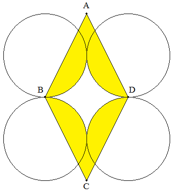 (中学生レベル) 4つの半径rの円の中心は正方形をなしている。 また,B,Dは2円の接点である。 四角形ABCDはAC=4r,BD=2rのひし形である。 このとき,図の網掛けの部分の面積を求めよ。 | ![]() |