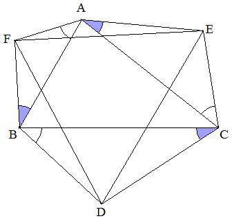 △ABCの外側に,3点D,E,Fを△DCB∽△EAC∽△FBAとなるようにとる。 このとき,△AFE+△DCB=△BDF+△EAC=△CED+△FBAを証明せよ。 | ![]() |