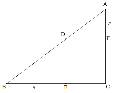 ∠C=90°の直角三角形ABCのAB上に点Dをとり,DからBC,CAに 下ろした垂線の足をそれぞれE,Fとする。 AF=p,BE=qとおくとき,長方形DECFの面積を求めよ。 | ![]() |
