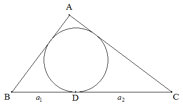 ∠A=90°の直角三角形ABCの内接円とBCとの接点をDとする。 BD=a1,DC=a2とおくとき,△ABCの面積を求めよ。 | ![]() |