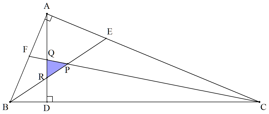 ∠A=90°,CA=12,AB=5である△ABCの内心をP,頂点Aから BCに下した垂線の足をD,BPとCA,ADとの交点をそれぞれE,R, CPとAB,ADとの交点をそれぞれF,Qとする。 (1) △PQRの外接円の半径を求めよ。 (2) △PQRの面積を求めよ。 | ![]() |
