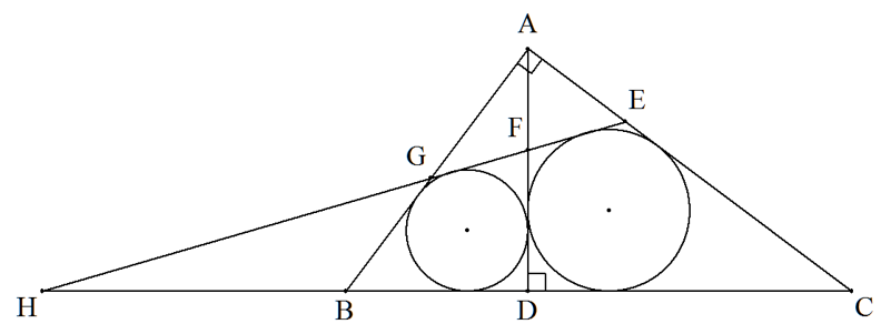 ∠A=90°,∠B=53°である△ABCについて,AからBCに下した 垂線の足をD,△ABD,△ACDの内接円のBCでない共通外接線と AC,AD,AB,CBとの交点を図のようにそれぞれE,F,G,Hとする。 このとき,∠GHBの大きさを求めよ。 | ![]() |