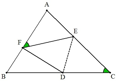 △ABCのBC,CA,AB上にそれぞれ点D,E,Fを,点FはDEに関して点Cと対称で, ∠AFE=∠Cとなるようにとる。 このとき, (1) △AFE=△EDCとなる△ABCの形状を答よ。 (2) 定規とコンパスを使って,(1)の条件を満たす△ABCと,△DEFを作図せよ。 | ![]() |