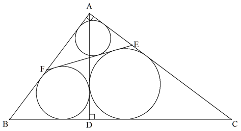 ∠A=90°である△ABCの頂点AからBCに下した垂線の足をD,△ABD,△ADCの 内接円の共通外接線のうちBC以外とCA,ABとの交点をそれぞれE,Fとする。 また,△ABD,△ACD,△AEFの内接円の半径をそれぞれr1,r2,r3とするとき, 次の等式を証明せよ。 r1r2/r3=(1/2)AD | ![]() |