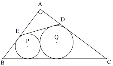 ∠A=90°,CA=4,AB=3である△ABCにおいて,図のように辺に接する2つの 円P,Qは互いに外接している。2つの円の共通外接線のうちBCでない方と CA,ABとの交点をそれぞれD,Eとする。 ∠AED=∠ACBのとき,DEを求めよ。 | ![]() |