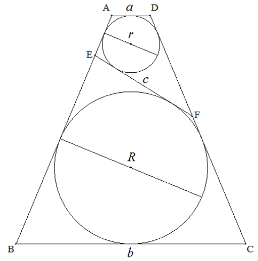 AD∥BC,AD<BCである等脚台形ABCDに,図のように小円と大円が3辺に 接している。2円の共通内接線とAB,CDとの交点をそれぞれE,Fとする。 AD=a,BC=b,EF=c (c2≧ab)とおくとき,次の問いに答えよ。 (1) 等脚台形ABCDの面積Sを求めよ。 (2) 小円の直径r,大円の直径Rをそれぞれ求めよ。 | ![]() |