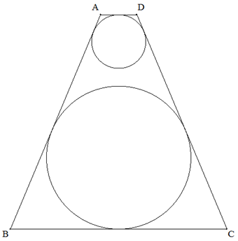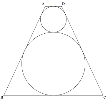 AD∥BC,AD<BCである等脚台形ABCD内に,図のように2つの円は共有点をもたず, それぞれ3辺に接している。AD=a,BC=bが一定であるとき,2つの円の直径の積の 値も一定になることを証明せよ。 | ![]() |