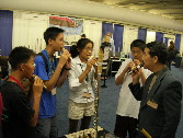 シャクルートを紹介するために、Montyさんと私で 25分間の「ショーケース」に臨みました。 会場のSunrise HallにはShakuluteに関心を持つ人たちが集まりました。 中には、フルートメーカーやフルートのアンサンブルグループを 編成するリーダーの方達もおりました。 最初にMontyさんが、尺八の歴史や構造、Shakuluteの製作に関わることなどを話し、 その後、15分間で、私がShakuluteを選択した理由、尺八やフルートにはない特徴を 説明し、それぞれ曲想が異なる三種類の即興曲を演奏しました。 (1)本曲「竹調べ」変奏 (2)日本古謡「さくら」変奏 (3)JAZZ即興 (1)では、フルートには難しいムラ息、ポルタメント奏法、各種揺りを取り入れ、 (2)では、尺八よりもクリアな音色とフルートでは表現しきれない微細な音の扱い、 (3)では、尺八のヘッドジョイントならではのテクニックを加えたJAZZ奏法、 尺八には難しい速いクロマティックを含むパッセージ等を織り交ぜ演奏しました。 前々日から、この日のためにリハーサルをし、 適切なアドバイスをしてくれていたJohnさんや加代さんから、 「時間通りに、的確な内容で説明できた」と喜んでいただけました。 このあと、Montyさんが尺八とシャクルートを展示するブースに 多くの老若男女フルーティスト達が興味と関心を持って集まり、 早速、Shakuluteにトライしたのは言うまでもありません。 (展示フルートメーカー87社、その中にMontyさんのブースが設けられたのです。) |